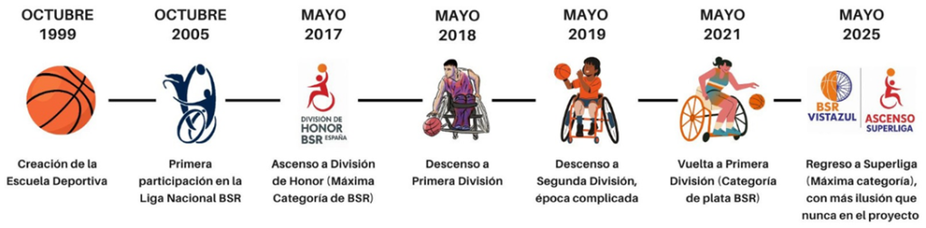 Varios fueron los años que pasamos en las categorías inferiores de la competición nacional, pero fue en el 2017 cuando culminamos el esperado ascenso a la División de Honor (Máxima categoría de BSR España). Aunque fue un breve paso por la categoría, que trajo un nuevo descenso en la temporada siguiente. Vivimos unos años complicados, alternando ascensos y descensos. Además, se produjo un relevo en la directiva después de tantos años. En estos momentos el club se encuentra en uno de sus mejores momentos, sobre todo a nivel institucional y de estructura, que se ha traducido en el segundo ascenso a la Superliga BSR, sin duda un gran escaparate al baloncesto en silla europeo y mundial.
